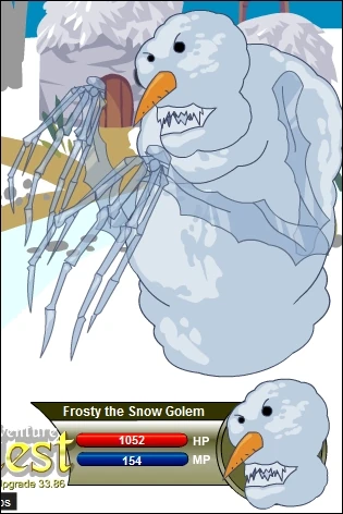 Frosty is a Snow Golem created by the ebil moglin necromancer Zorbak, to be part of his Ebil Empire and ruin the holiday of Frostval. Along with Sandy Claws, he attacks Frostvale, and usually steals the presents.